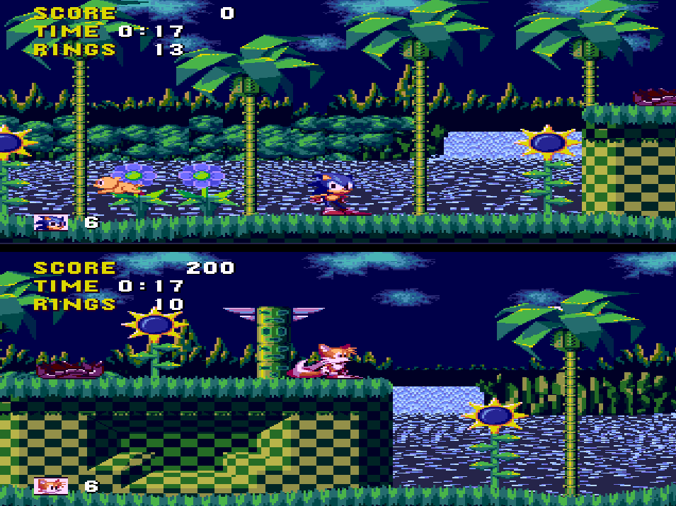 Помните во втором Сонике режим гонки на двоих? Кто быстрее пройдет уровень, больше мониторов и колец соберет и кто больше очков набьет? А при прохождении игры можно за вторым геймпадом Тейлзом управлять. А хотелось пройти игру на двоих, но на раздельном экране, как в гонках? Вот вам пожалуйста, данный хак дает вам такую возможность. Проходите игру бегая кто где хочет. |